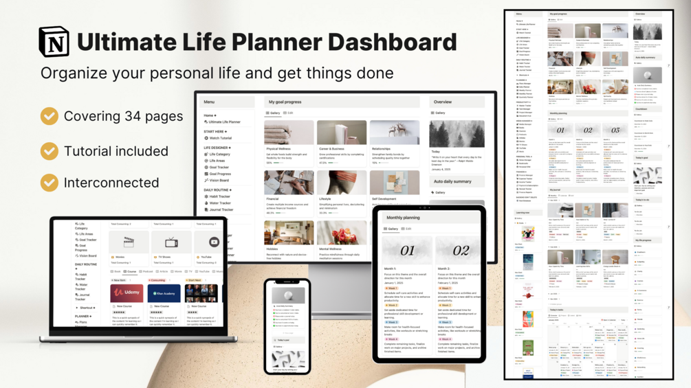 This Ultimate Life Dashboard organizes your daily tasks, plans, goals, habits, journal, notes, bookmarks, reading, (and more) in one place!
